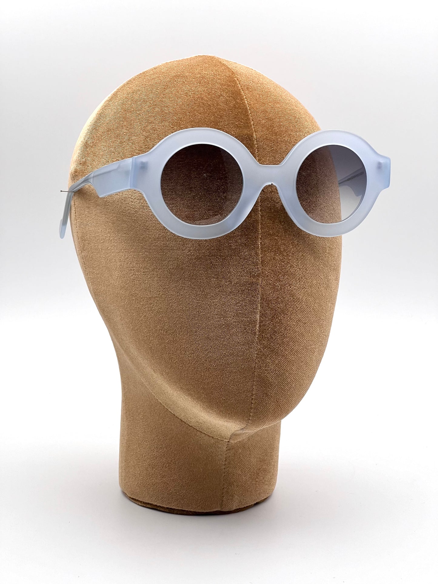 Tondo in lastra di cellulosa celeste, lenti da sole grigio sfumate.