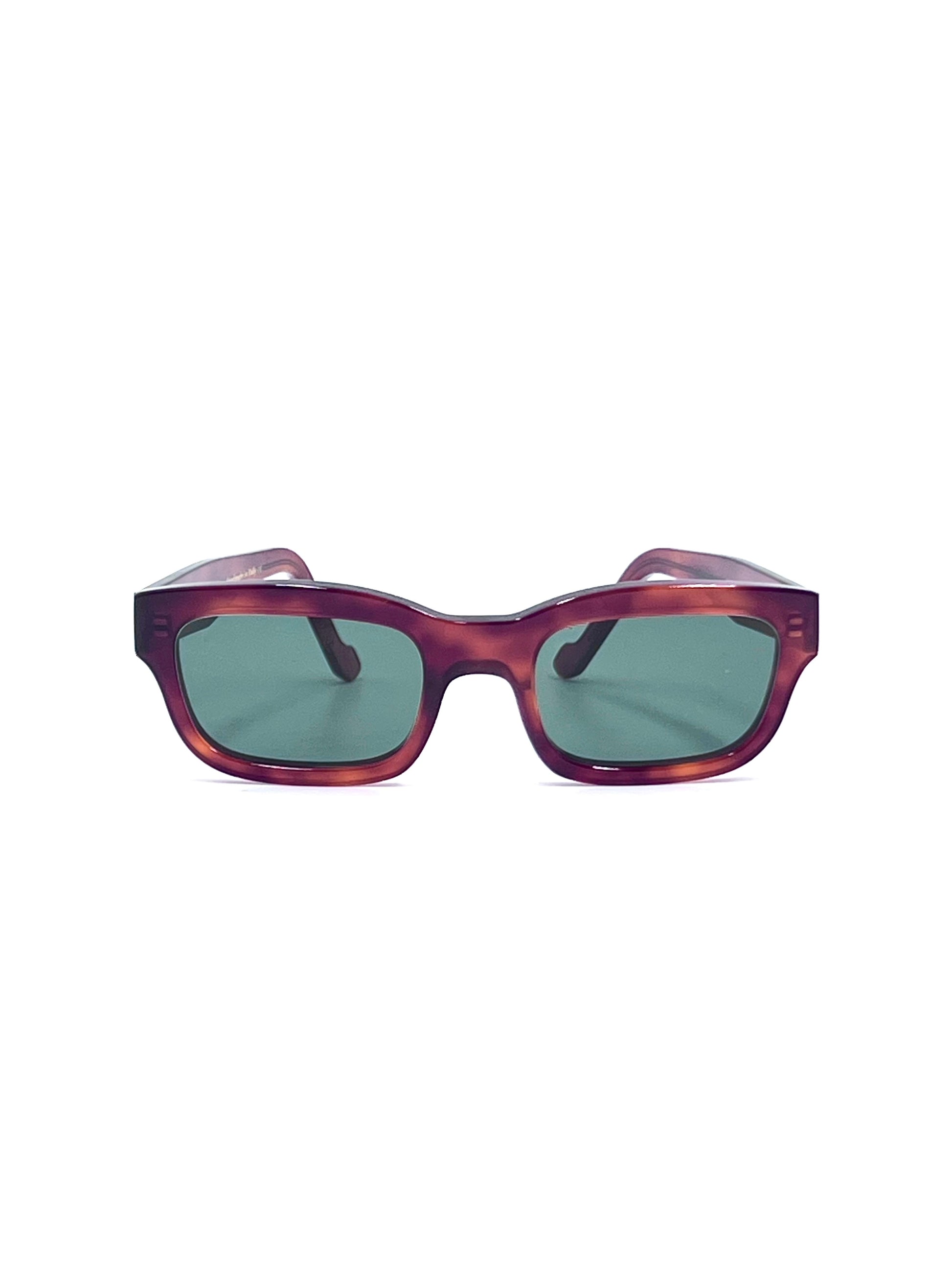 Moderno rettangolare in lastra di cellulosa avana vintage marrone, lenti da sole verde grafite. Fatto artigianalmente a mano in Italia.