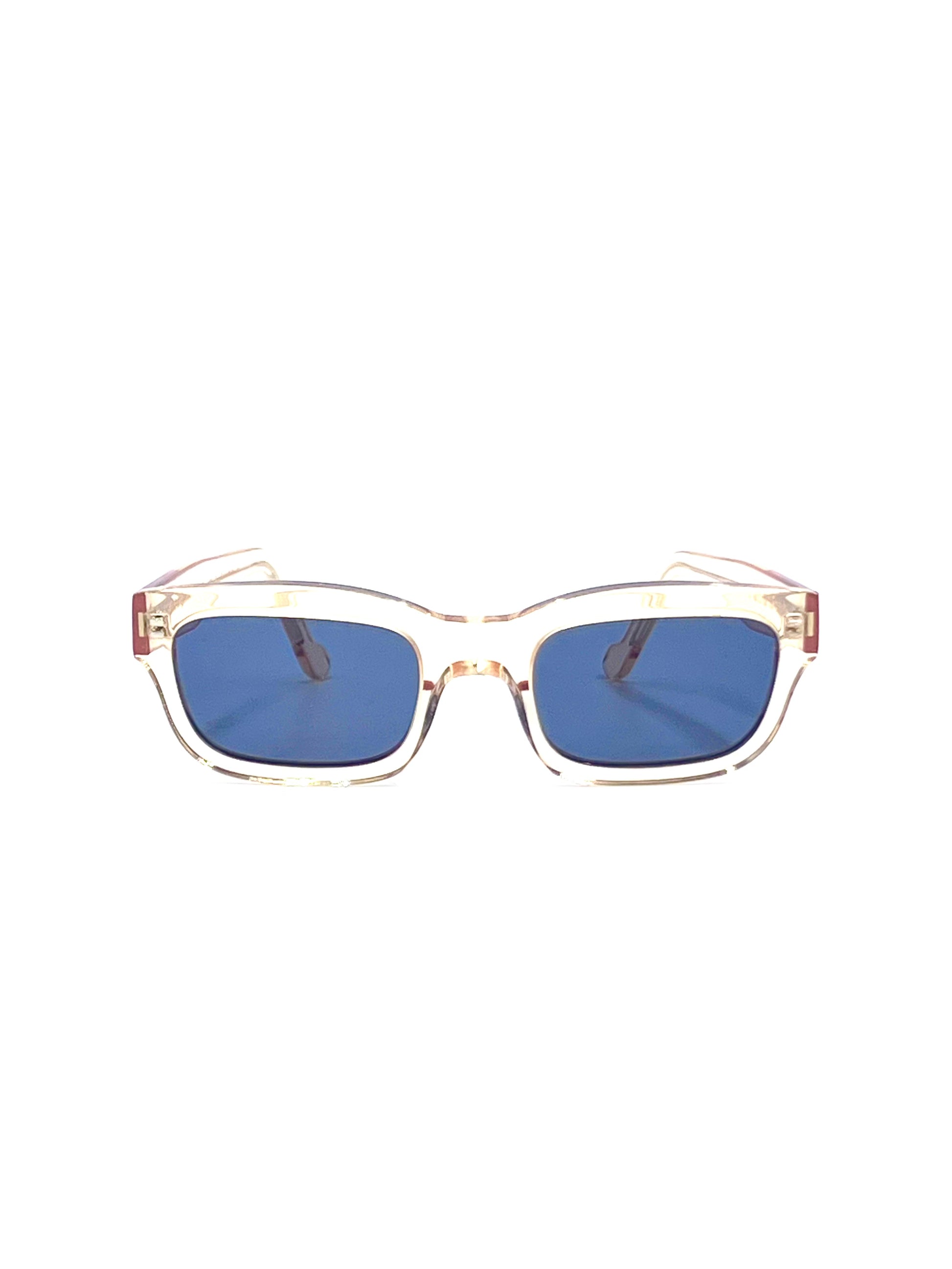 Moderno rettangolare in lastra di cellulosa cristallo champagne vintage lucida, lenti da sole blu. Fatto artigianalmente a mano in Italia.