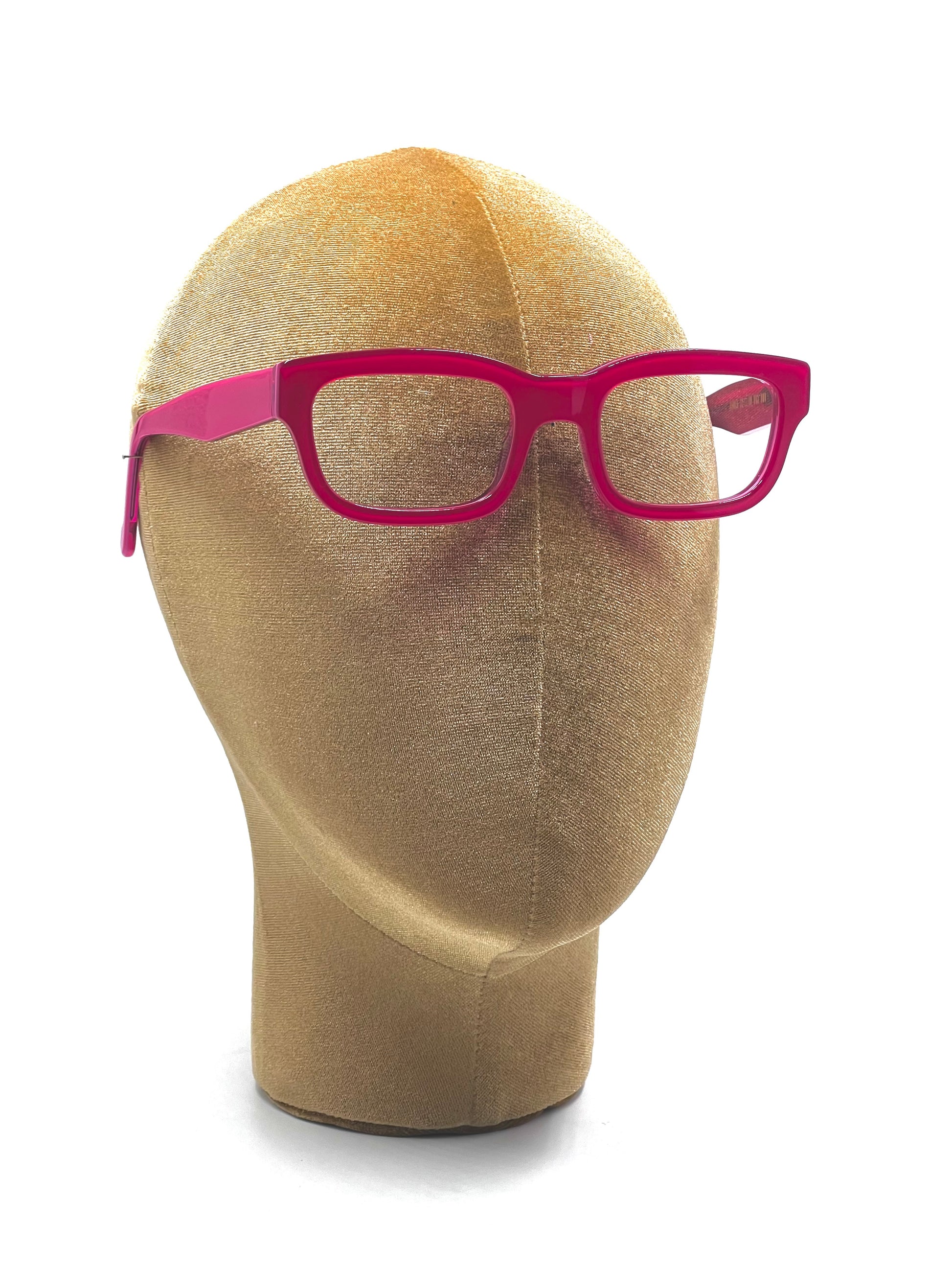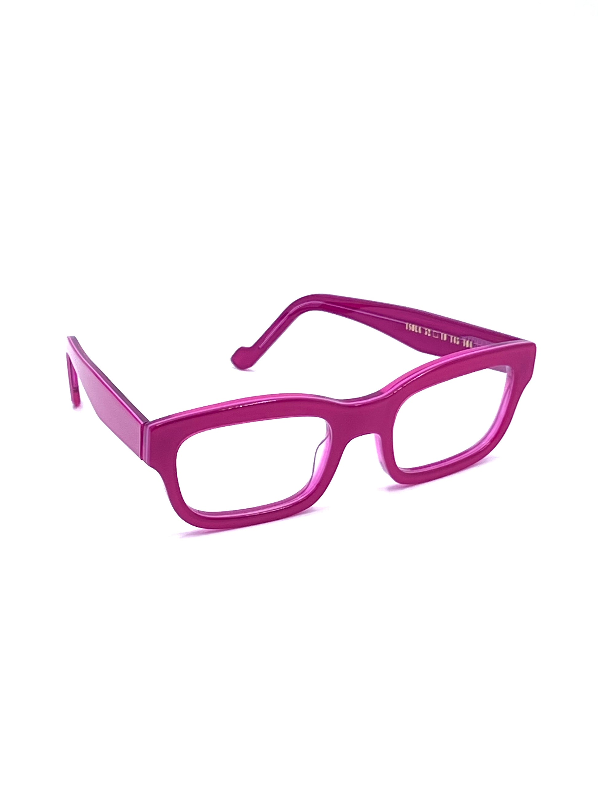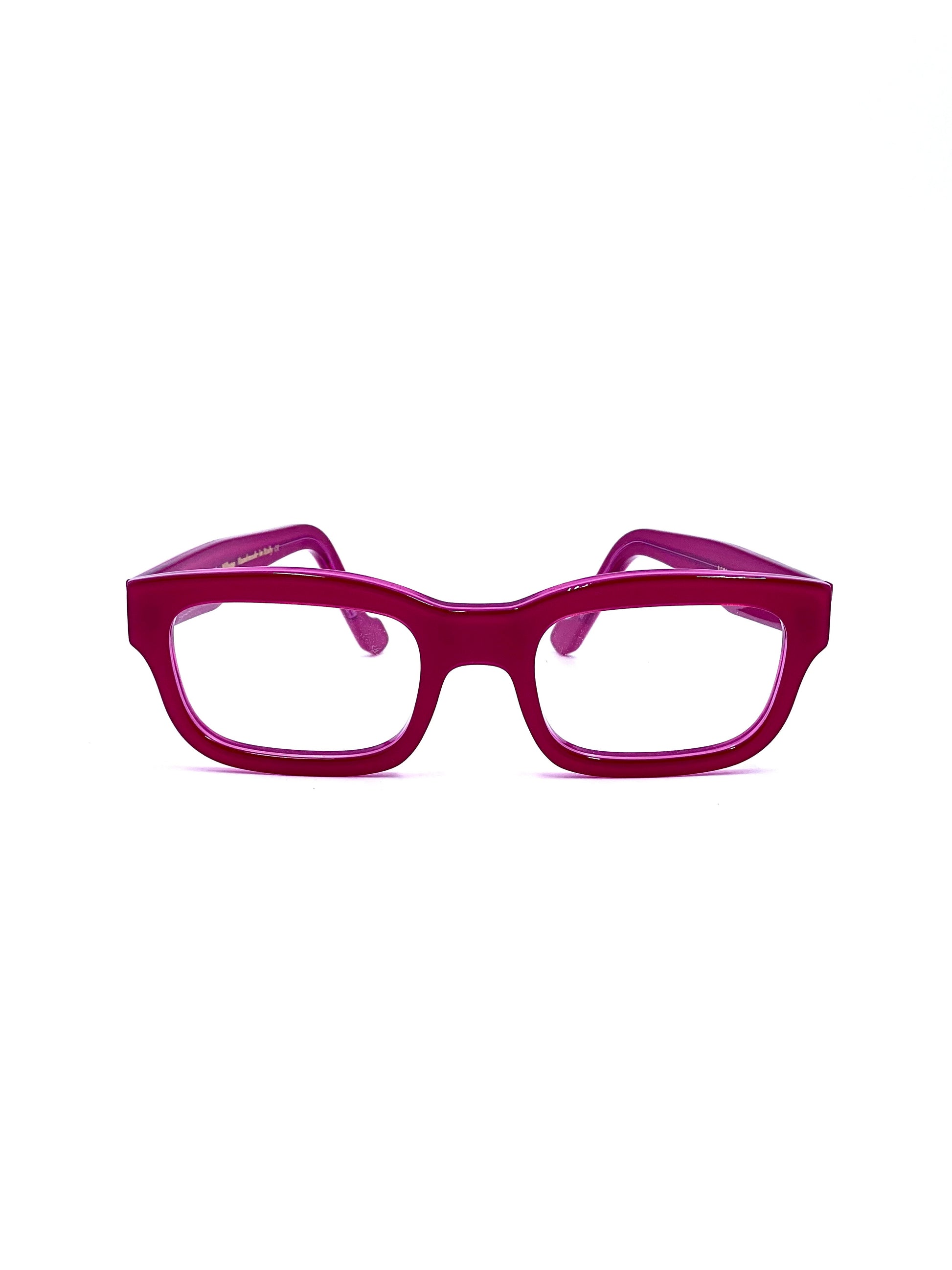 Moderno rettangolare in lastra di cellulosa traslucida bicolore, fucsia all’esterno e rosso lampone all’interno. Modello di una collezione speciale che rievoca i quartieri più famosi di Milano. Fatto artigianalmente a mano in Italia.