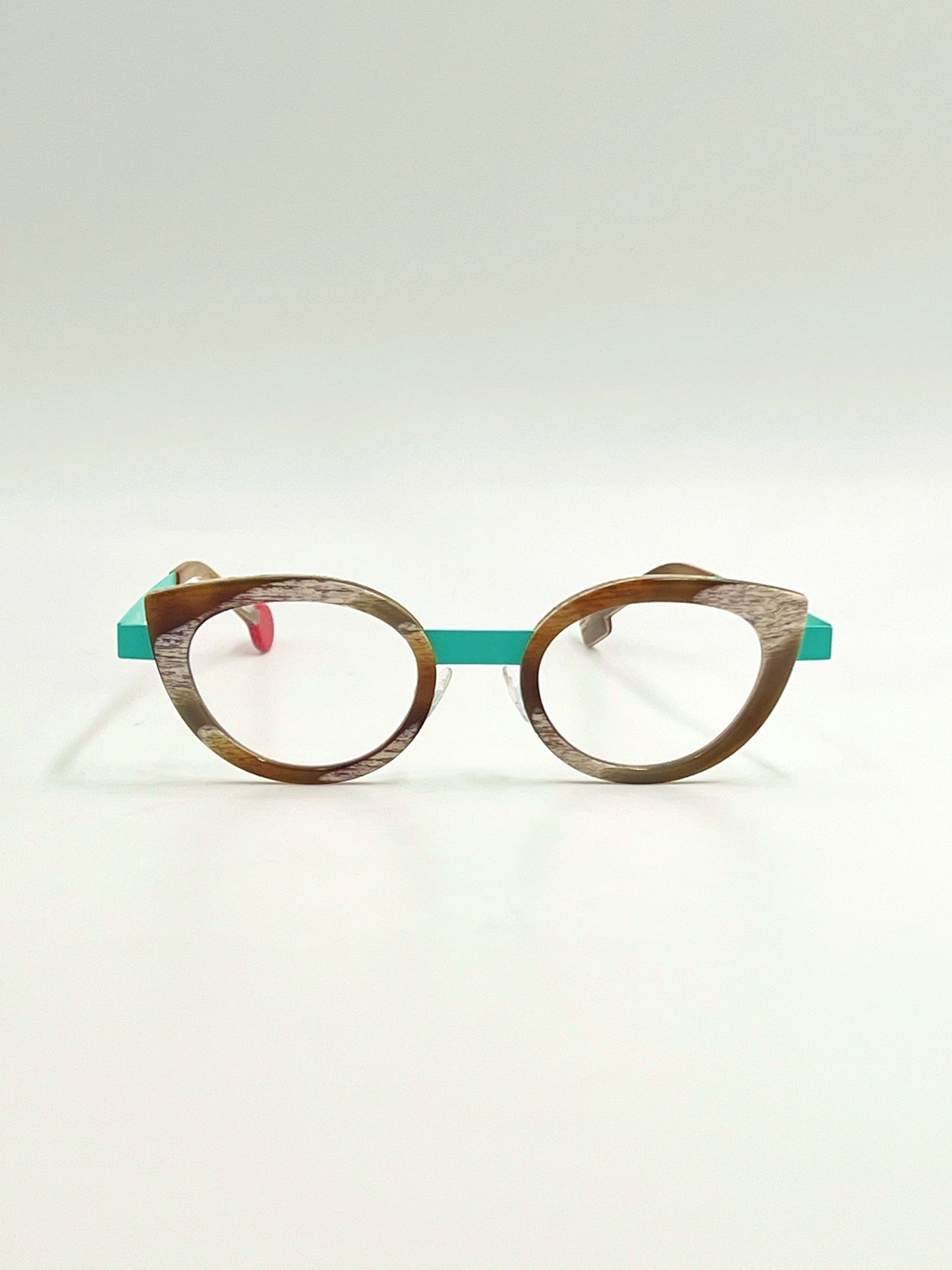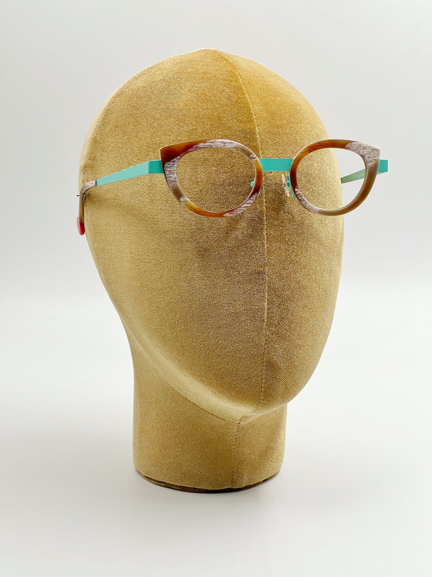 Farfallina in metallo turchese satinato Tiffany, oculari tortora striato avorio. Fatti in mano in Francia.