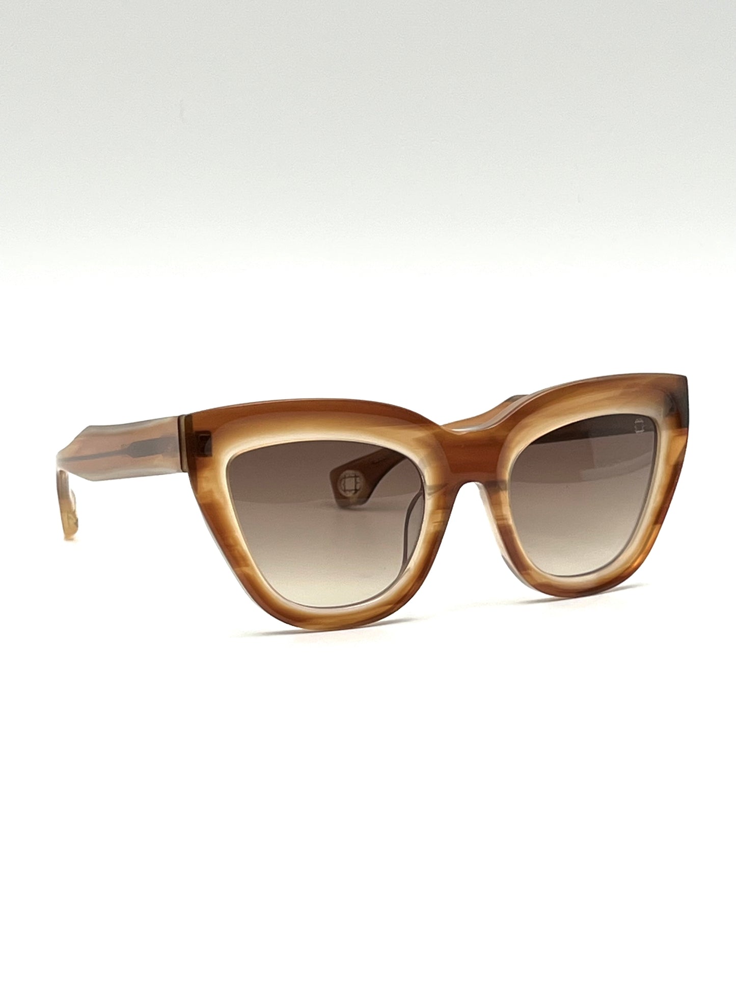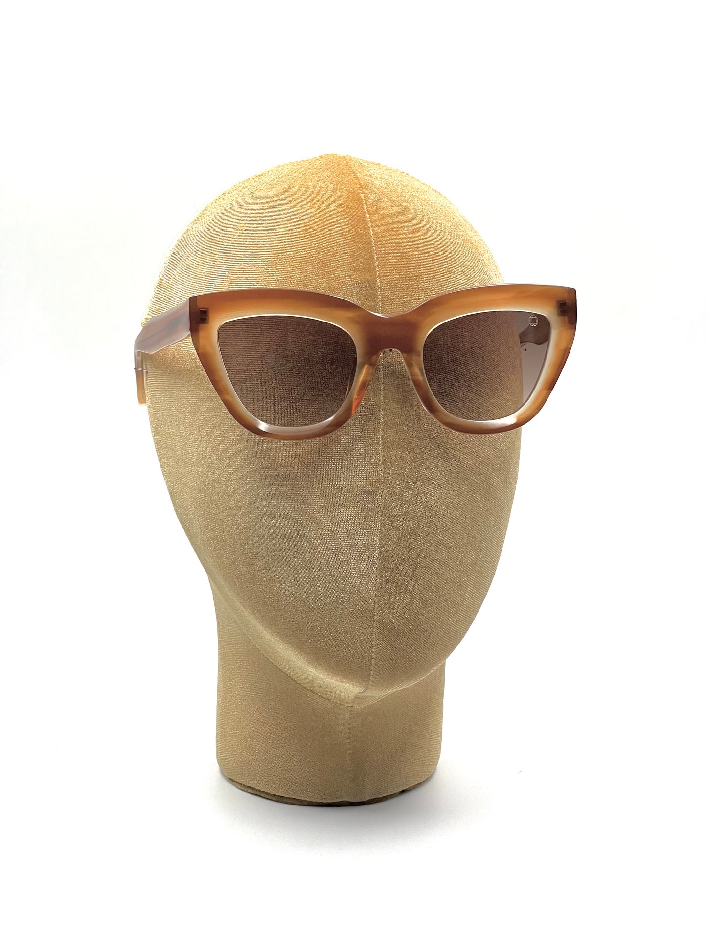 Farfalla in lastra di cellulosa giapponese, colore avana ambrata corno, lenti da sole marroni sfumate. Fatto a mano in Giappone. Designer nippo californiano.