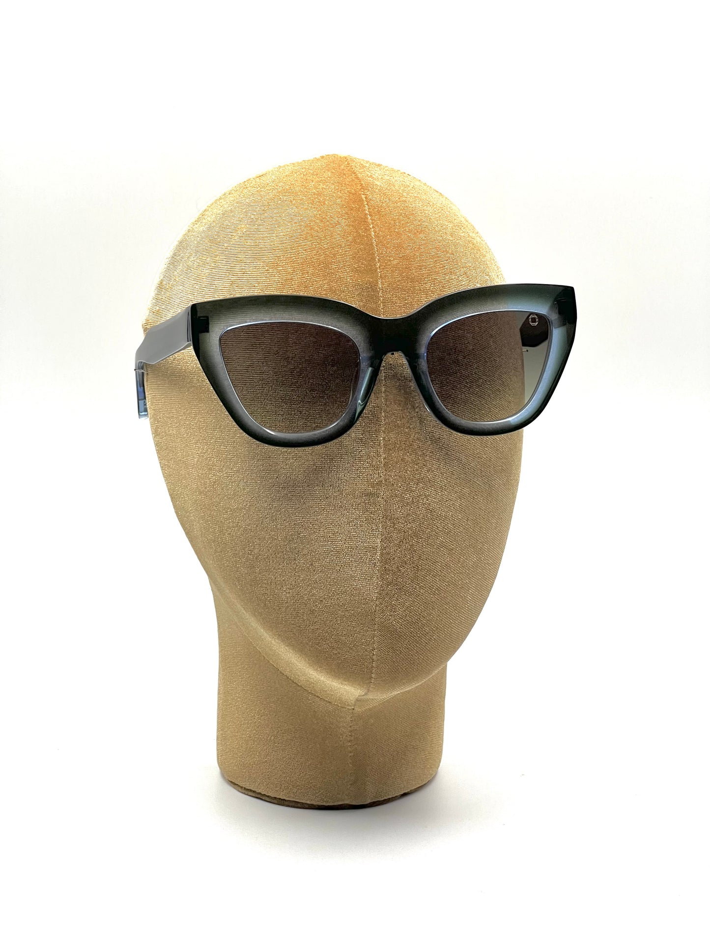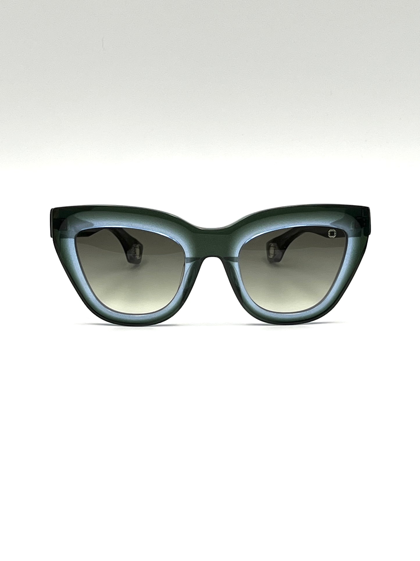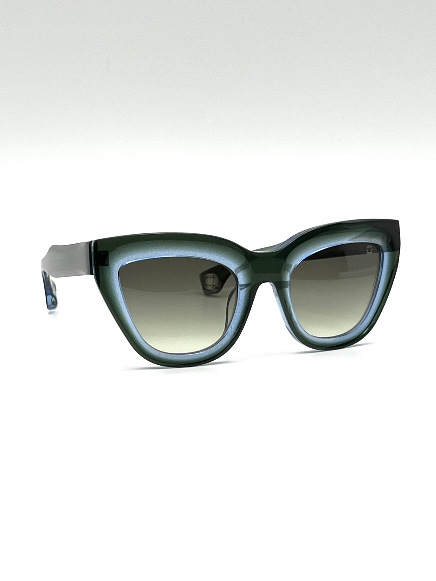 Farfalla in lastra di cellulosa giapponese, colore verde blu su base translucida glitterata, lenti da sole verde scuro sfumate. Fatto a mano in Giappone. Designer nippo californiano.