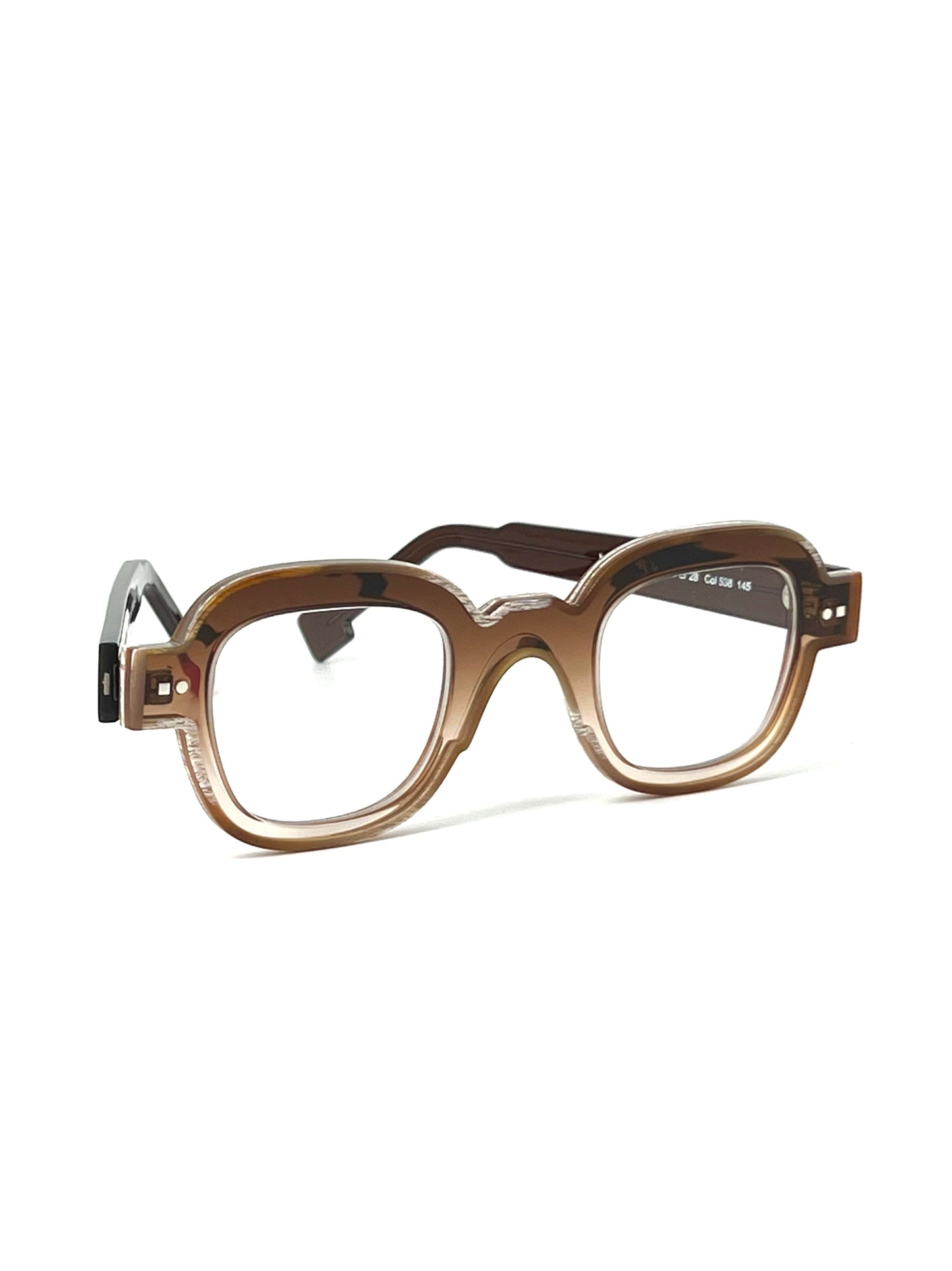 Squadrato spessorato con angoli arrotondati, in lastra di cellulosa lucida cristallo caramello sfumato, profilo corno vintage, ponte a chiave. Fatto a mano in Francia.