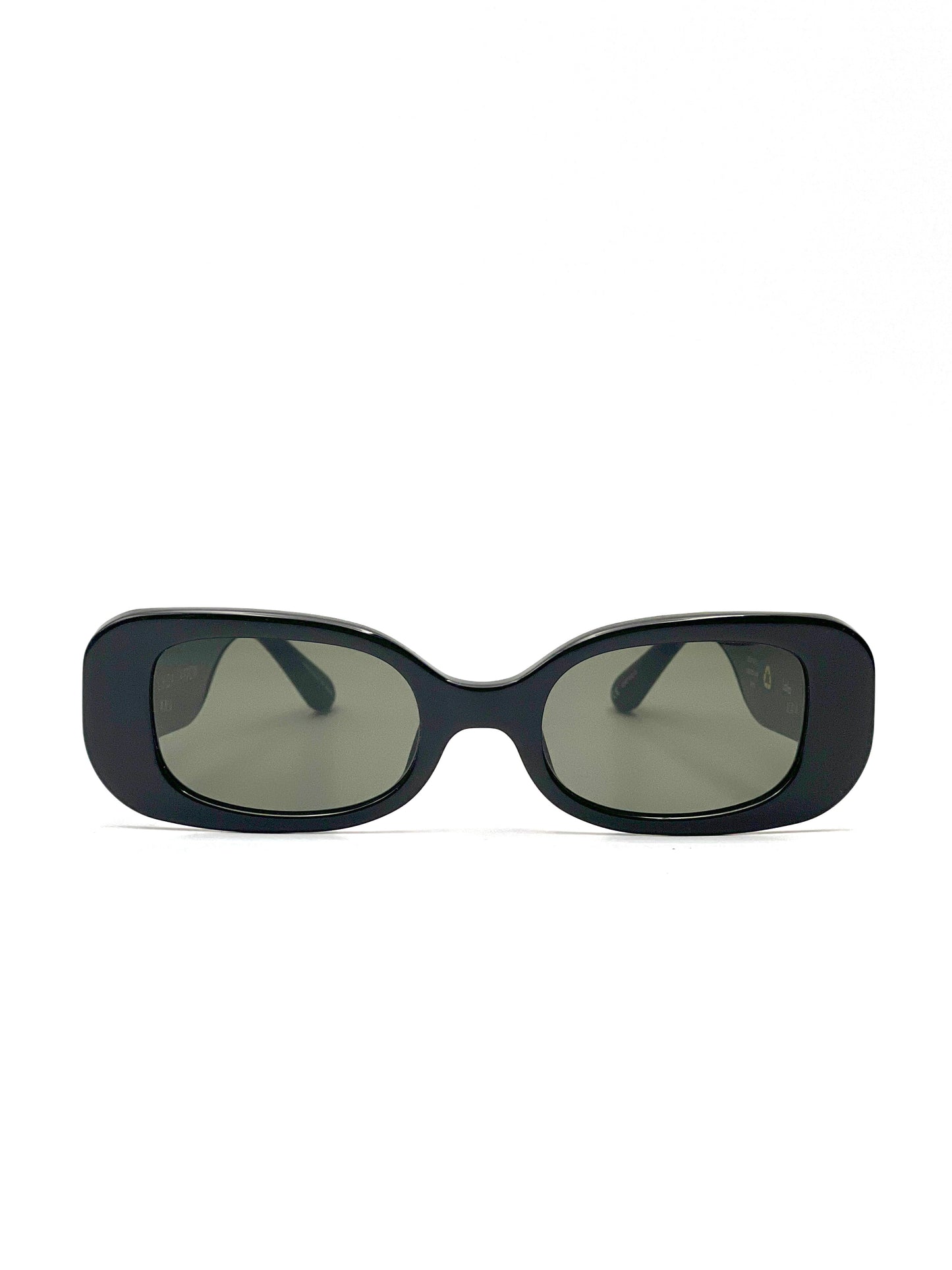 Rettangolo spessorato con angoli arrotondati in lastra di cellulosa nera lucida, lenti da sole grigie, aste larghe impreziosite da foro in metallo placcato oro per inserimento catenella porta occhiali. Fatto in Giappone.