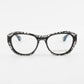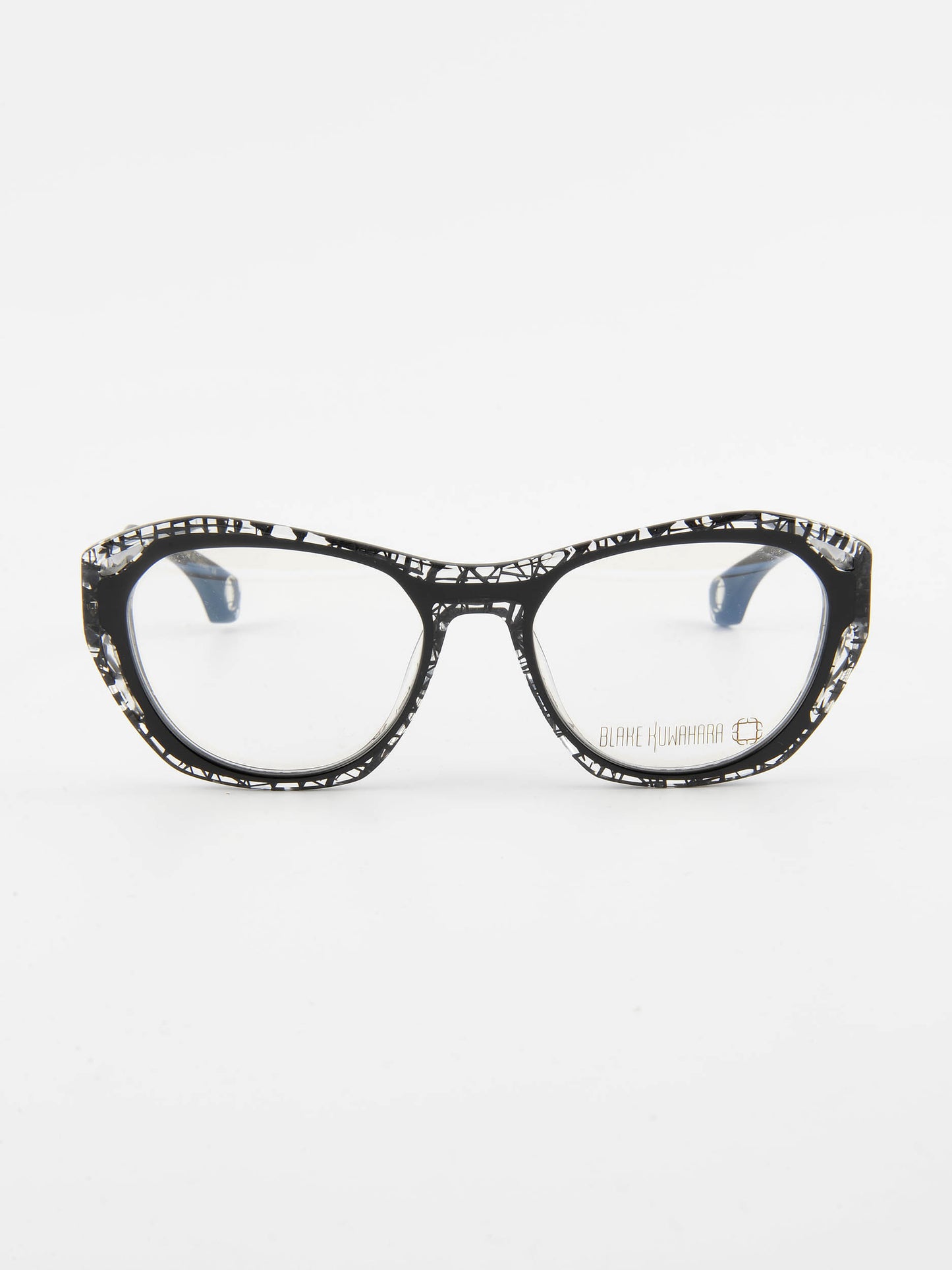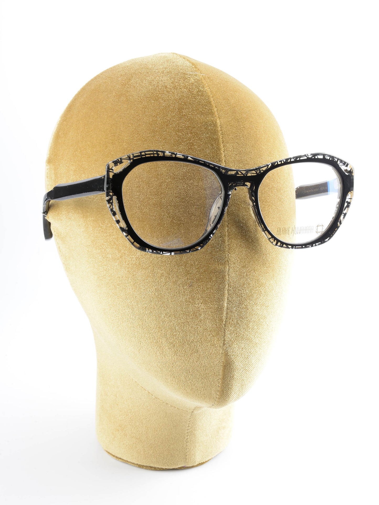 Farfalla oversize in lastre fuse di cellulosa cristallo translucido e inserti neri a rete. Fatto a mano in Giappone. Designer californiano.