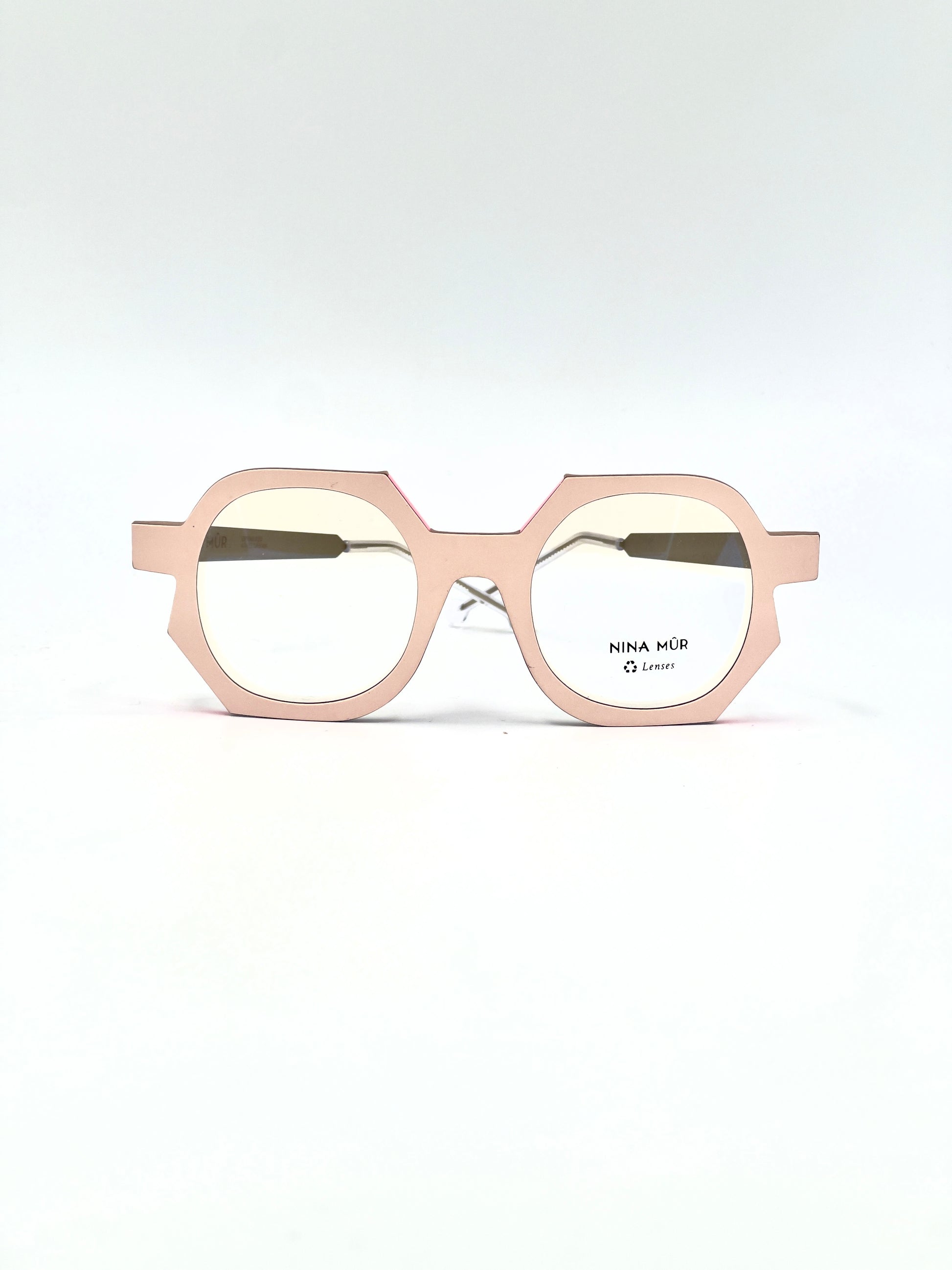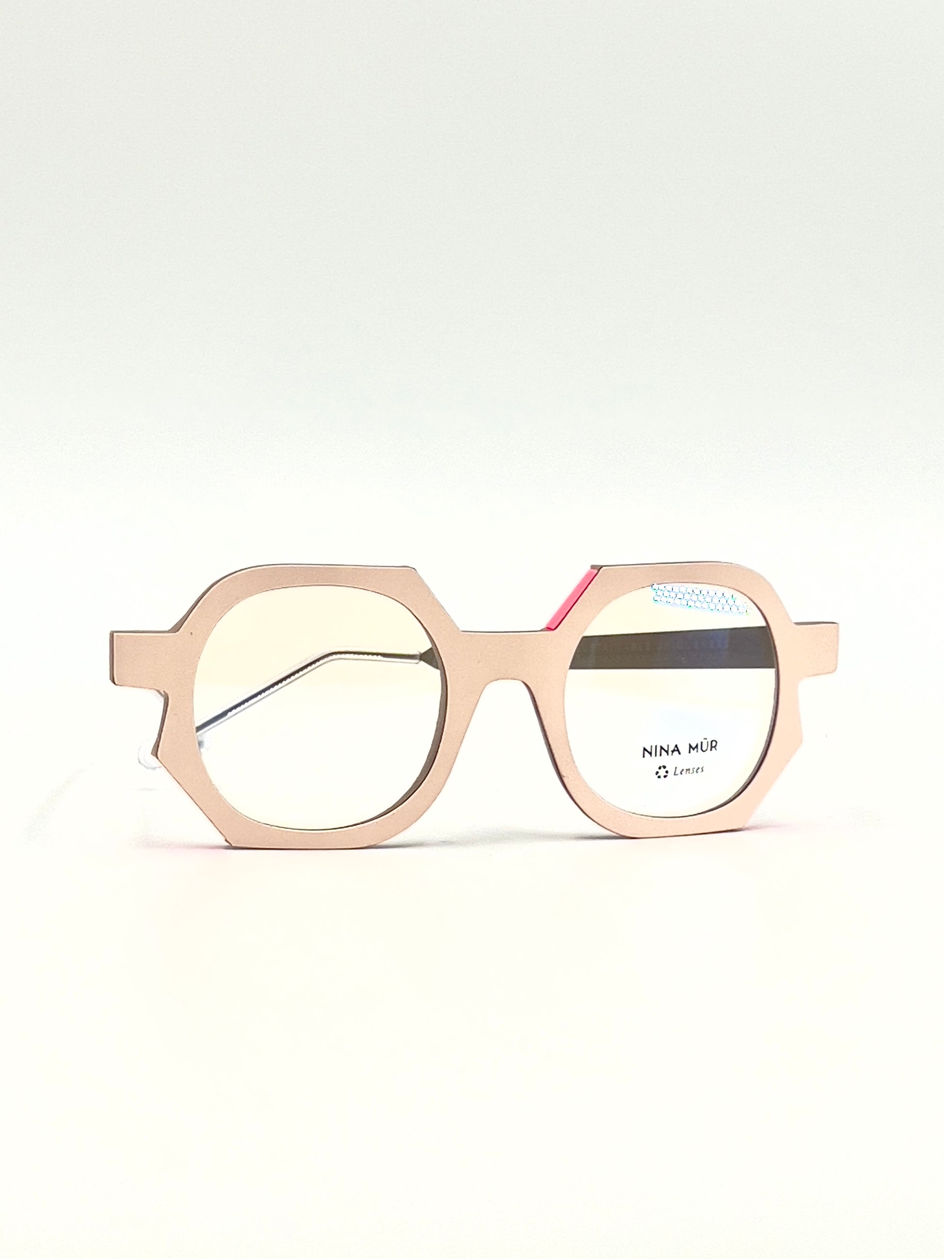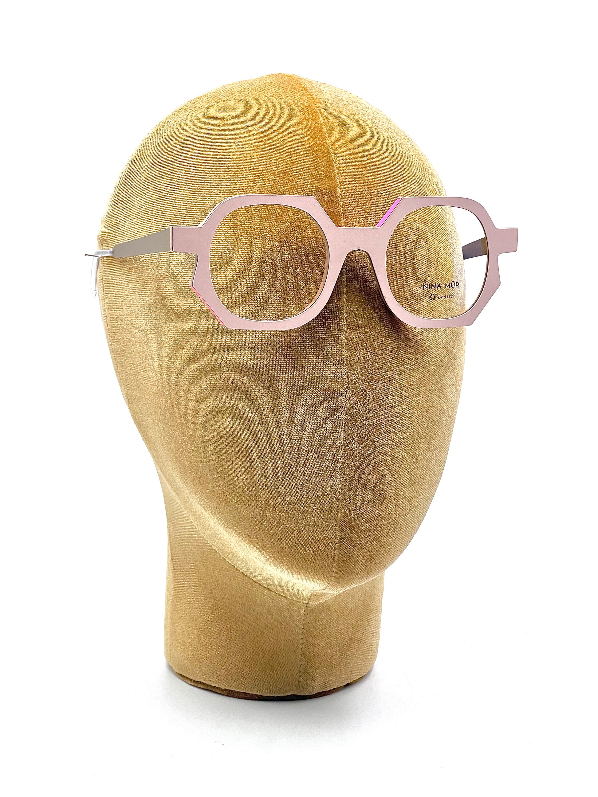 Forma astratta in leggerissimo legno di betulla rosa pastello e aste metallo oro 9mm. Bordi esterni con particolari in rosa fluo. Fatto a mano a Madrid.